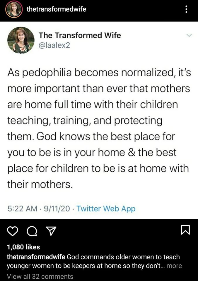 She supports Biblical Gender roles (“Larry Solomon”) who is a pedophile (says  girls as young as 10 should be allowed to marry and has a whole article about grooming children for older men, which is revolting – Matthew 18:6) and he supports polygamy (bonus: he’s also pro-rape, what a Godly Christian man).