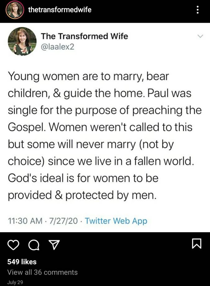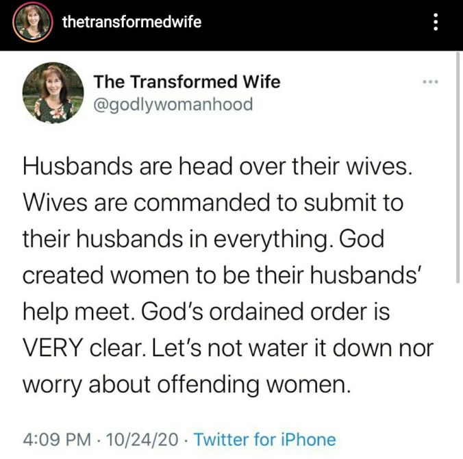 Lori cushions her harmful rhetoric with more generic stuff like look out for red flags, don’t be a jerk to your man, etc. that most sane people will agree with. However, the core of her ideology is not based on the Bible. Case in point, there is no Biblical basis for a woman to take her husband’s last name after marriage.