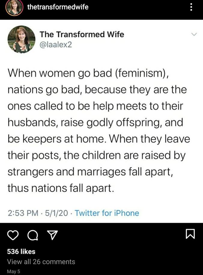 Lori Alexander or The Transformed Wife is a “Christian” who promotes traditional, conservative values based on her personal opinions.