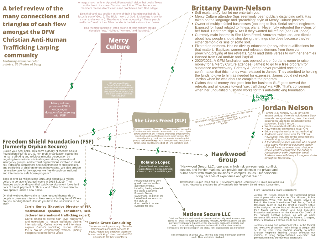 People smarter than me who aren’t wasting time playing video games have already detailed why Freedom Shield, Mercy Culture, and Brittany Dawn are so shady, and how they’re all connected. Wapo also did an article on Mercy Culture (the church she attends).