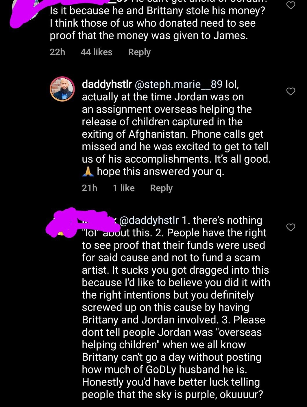Brittany eventually responded to Hustler’s post, albeit not with receipts showing where the money went. But with two comments, captured here and here, claiming they call James every week except… James couldn’t get in touch with Jordan? The same Jordan with total control over his money.