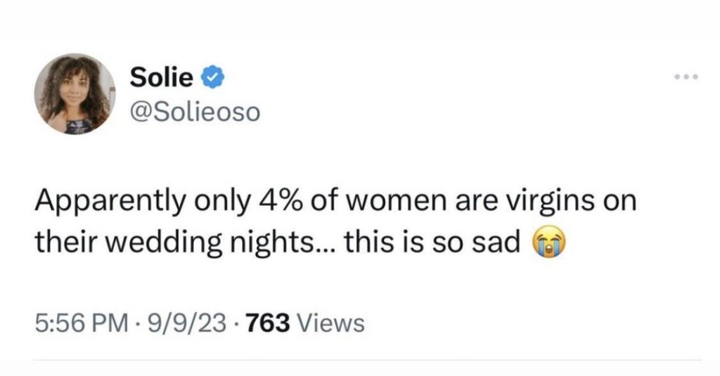 The Bible says, “Do not judge, or you too will be judged. For in the same way you judge others, you will be judged, and with the measure you use, it will be measured to you. Why do you look at the speck of sawdust in your brother’s eye and pay no attention to the plank in your own eye?” (Matthew). Solie, who by her own beliefs is a wicked sinner, has no business being “sad” women aren’t virgins, nor judging them.