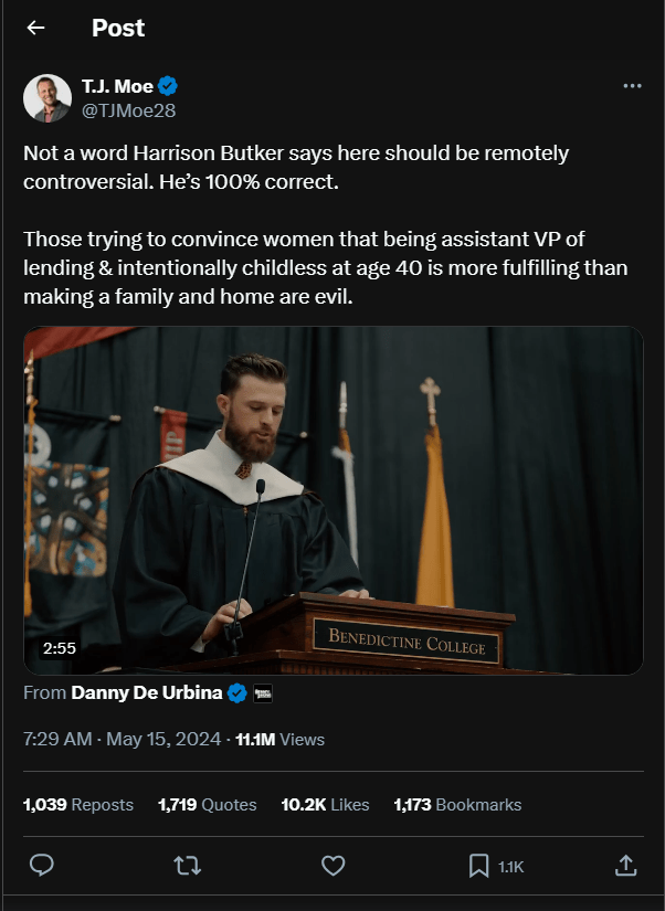 If folks like Harrison Butker spent half as much air encouraging men to be good fathers, husbands, providers, to lay their lives down for their wives being willing to die for them as the Bible says, as they do telling women to have kids, we’d actually see a resurgence in the family structure.